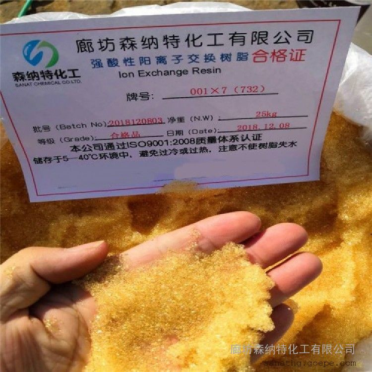 001x7是在交联为7%的苯乙烯-二乙烯苯共聚体上带有磺酸基(-SO3H)的阳离子交换树脂。主要用于食品、制药、硬水软化和纯水制备,也用于湿法冶金、制糖、制药、味精行业,以及作为催化剂等。